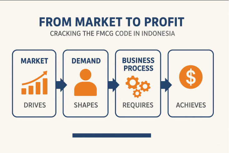 Indonesiaโs FMCG market isnโt standing stillโitโs sprinting. And like any good relay race, profit only comes if each hand-off is smooth. Using a ๐ ๐ฐ๐๐ถ๐ป๐๐ฒ๐-๐๐๐๐น๐ฒ ๐ณ๐น๐ผ๐, hereโs how the journey from Market โ Demand โ Business Process โ Efficiency โ Margin plays out across the archipelago.